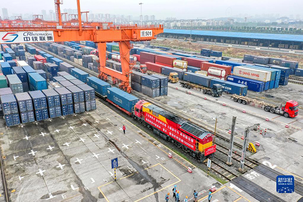 中歐班列(重慶)第10000列列車在重慶團結村中心站等待發(fā)車(2022年6月23日攝,無人機照片)。新華社記者 黃偉 攝