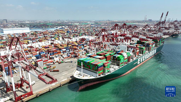 山東港口青島港前灣港區(qū),集裝箱貨輪在碼頭裝卸集裝箱(2022年6月15日攝,無人機照片)。新華社記者 李紫恒 攝