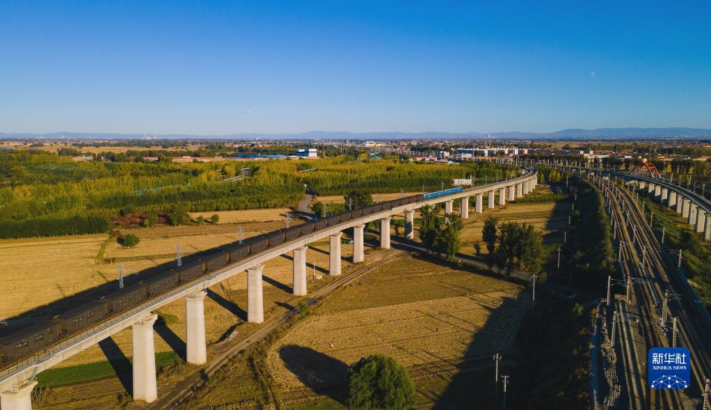 這是在內(nèi)蒙古呼和浩特拍攝的運(yùn)煤專列(2021年10月15日攝,無人機(jī)照片)。新華社發(fā)(夏亮 攝)
