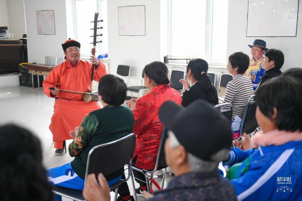 內(nèi)蒙古興安盟科爾沁右翼中旗巴彥敖包嘎查的蒙古族村民在鄉(xiāng)村文化活動(dòng)室表演蒙古族藝術(shù)烏力格爾(2019年4月17日攝)。新華社記者 彭源 攝