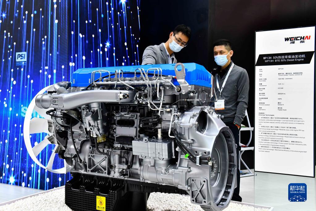在山東濟(jì)南召開的第二屆世界內(nèi)燃機(jī)大會(huì)上,濰柴集團(tuán)展示的高熱效率柴油發(fā)動(dòng)機(jī)(2021年4月21日攝)。新華社記者 郭緒雷 攝