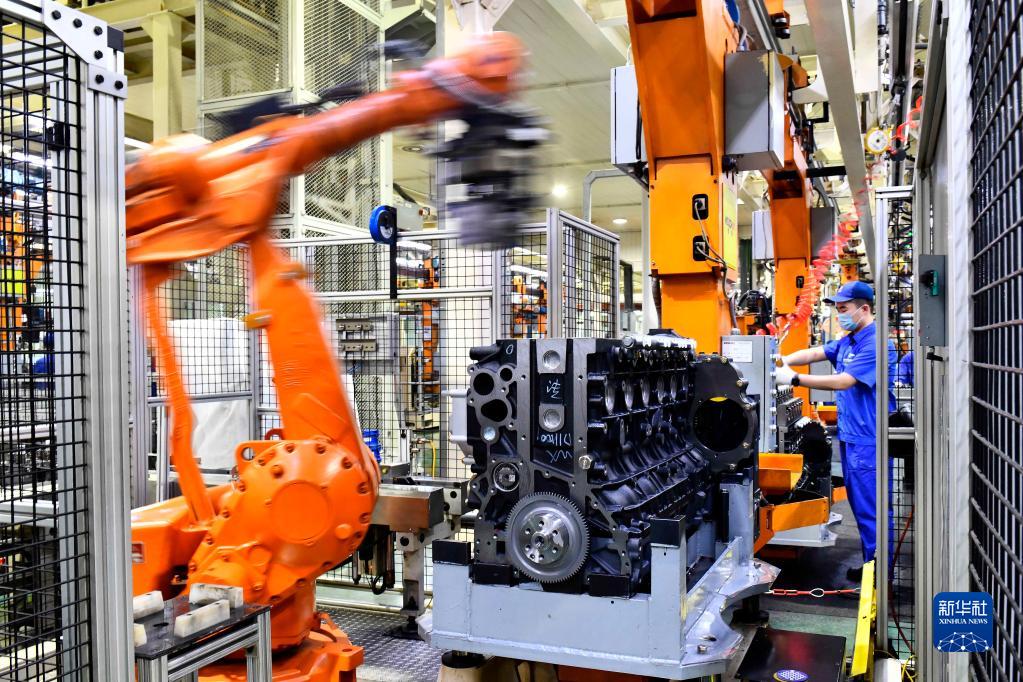 在位于山東濰坊的濰柴集團(tuán)總裝車間,機(jī)器人在流水線上裝配發(fā)動(dòng)機(jī)(2021年4月22日攝)。新華社記者 郭緒雷 攝