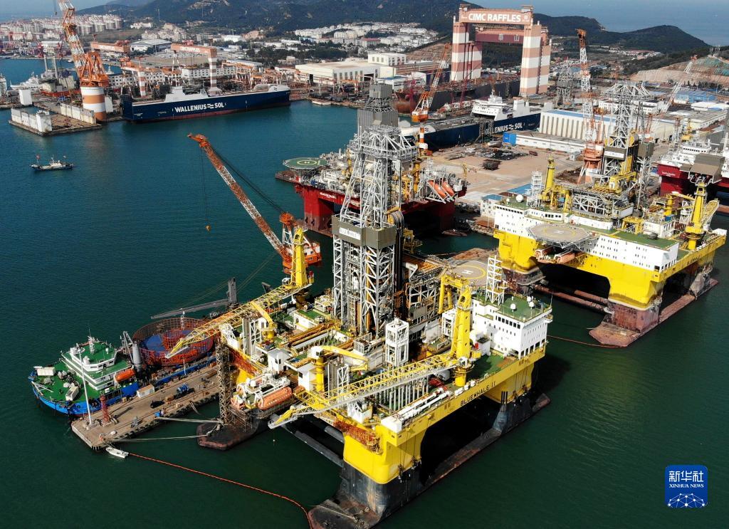 這是“藍(lán)鯨1號(hào)”(前右)及姊妹平臺(tái)“藍(lán)鯨2號(hào)”(前左)在其生產(chǎn)基地中集來福士海洋工程有限公司煙臺(tái)基地進(jìn)行維護(hù)和保養(yǎng)(2021年10月18日攝,無人機(jī)照片)。新華社記者 李紫恒 攝