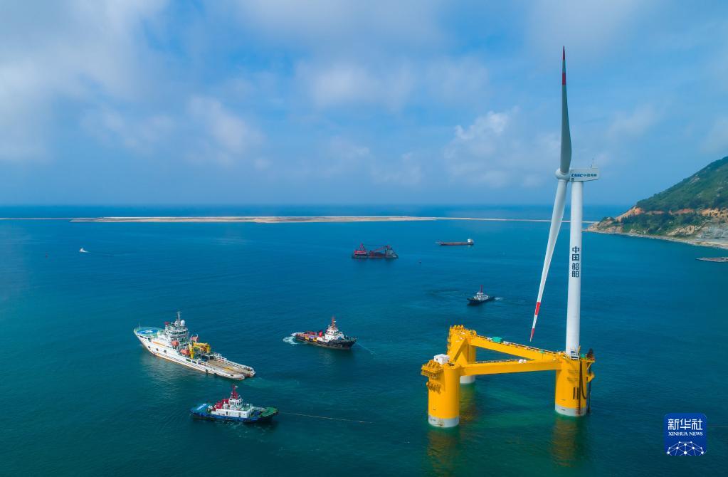 國內(nèi)首臺深遠(yuǎn)海浮式風(fēng)電裝備“扶搖號”從廣東省茂名市廣港碼頭拖航前往羅斗沙海域進(jìn)行示范應(yīng)用(2022年5月29日攝,無人機(jī)照片)。新華社記者 劉大偉 攝