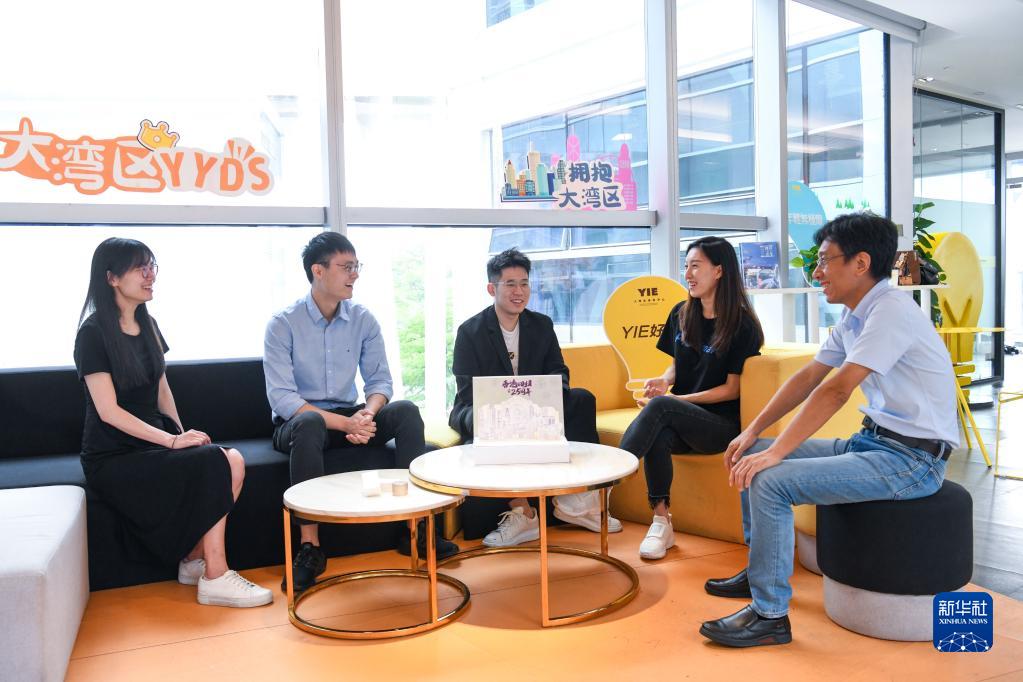在位于深圳市的前海深港青年夢工廠,香港創(chuàng)業(yè)青年們一起交流各自的創(chuàng)業(yè)項(xiàng)目(2022年6月20日攝)。新華社記者 梁旭 攝