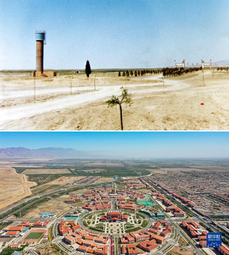 拼版照片:上圖為建設(shè)初期的寧夏永寧縣閩寧鎮(zhèn)景象(資料照片);下圖為2021年6月3日拍攝的寧夏永寧縣閩寧鎮(zhèn)(新華社記者馮開華攝,無人機照片)。新華社發(fā)