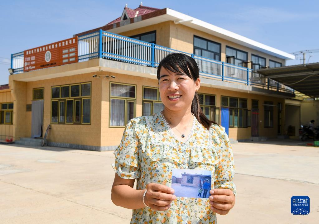 2022年8月4日,寧夏吳忠市紅寺堡區(qū)新莊集鄉(xiāng)白墩村村民王航弟在自家二層樓房前。她手里拿著的是10多年前住房的照片。新華社記者 馮開華 攝