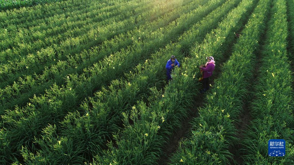 農(nóng)戶在寧夏吳忠市紅寺堡區(qū)柳泉鄉(xiāng)黃花菜基地采摘黃花菜(2022年7月5日攝,無人機照片)。新華社記者 王鵬 攝
