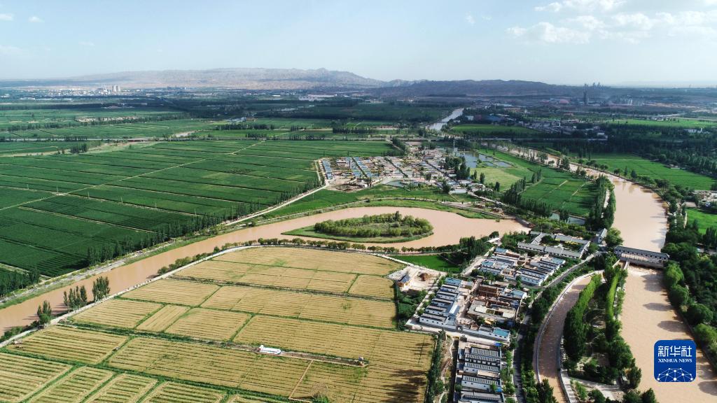 位于黃河分水口的寧夏青銅峽市大壩鎮(zhèn)韋橋村(2022年7月5日攝,無人機照片)。新華社記者 王鵬 攝